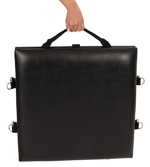 Переносная доска для связывания с плечевым ремнем. Для всех пар, которые хотят наслаждаться своими фетиш-фантазиями где угодно. В комплекте: складная доска с ремнем для переноски и набором для фиксации и ограничения, 4 манжеты для рук и ног, 1 шейный ремень с карабиновыми крючками, маска для глаз, кляп-шарик, ремни для фиксации. Длина стола в собранном виде – 60 см., ширина – 60 см.