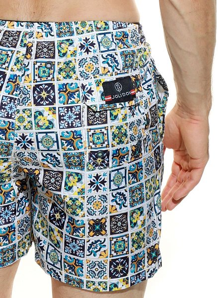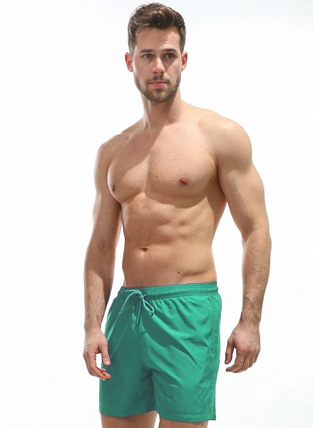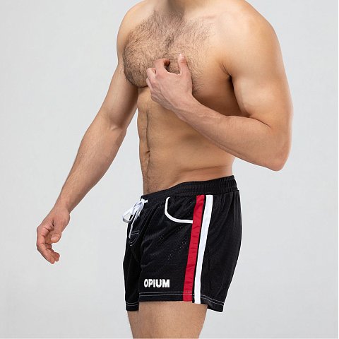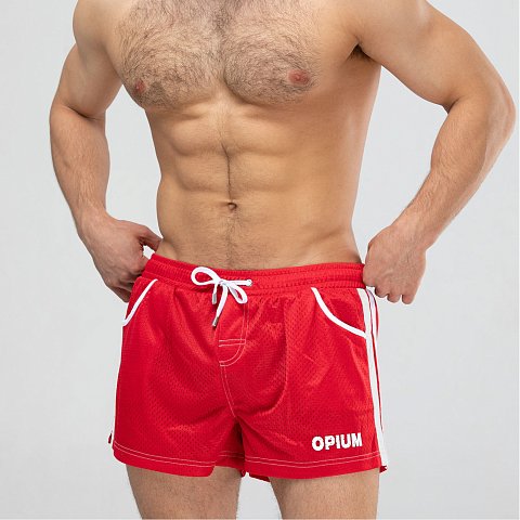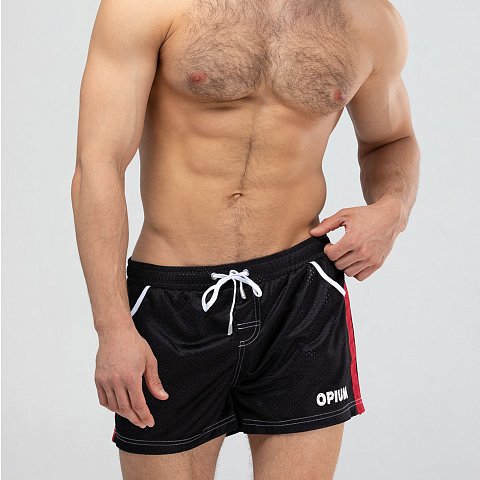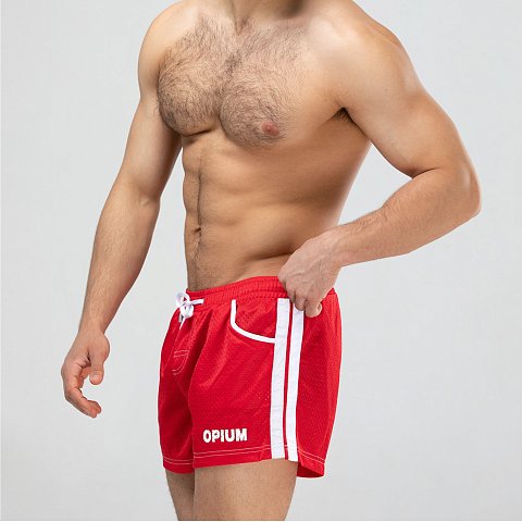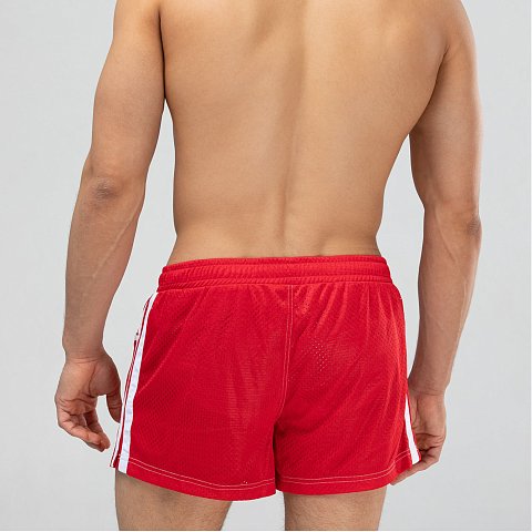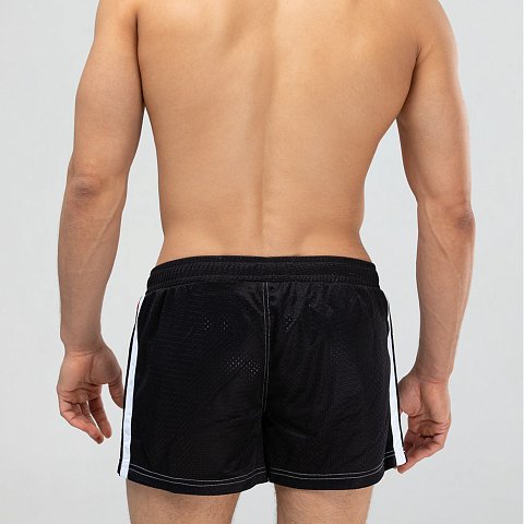 Мужские спортивные короткие шорты из быстросохнущего перфорированного двухслойного материала. Основной цвет оттенён яркими лампасами. Пояс на резинке дополнен регулирующим контрастным шнурком с брендированными металлическими эглетами. Удобные боковые карманы для мелочей. Контрастная отстрочка швов. Шорты имеют внутренние дополнительные сетчатые плавки для комфортного ношения. Эта модель отлично сидит и подходит не только для пляжа, плавания, но и активного занятия спортом.