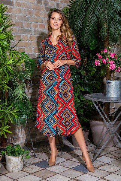 Платье-рубашка выполнено из принтованной вискозы. Модель на поясе свободного силуэта длины миди. Платье рубашечного типа с воротником стойкой и планкой застежкой на пуговицах. Рукав прямой длиной 3/4.