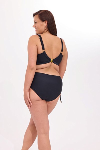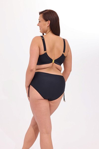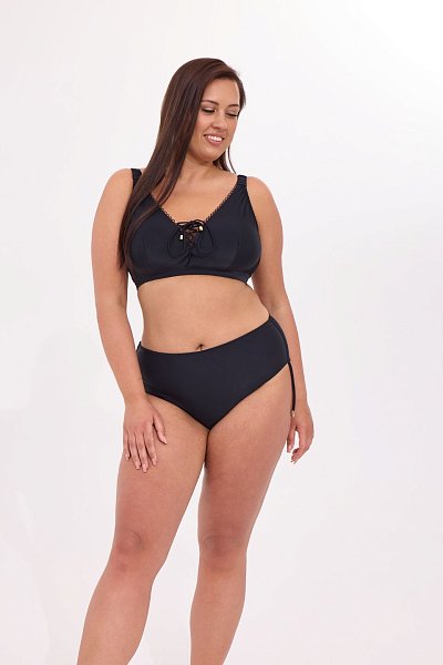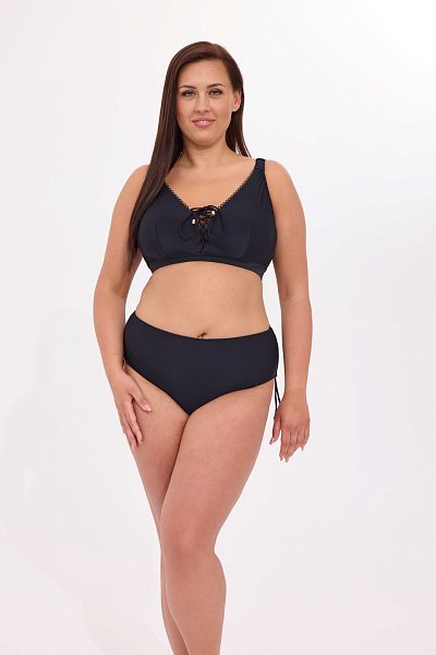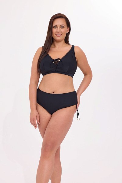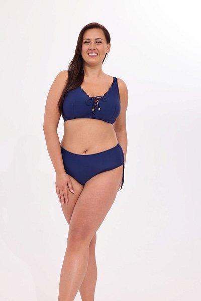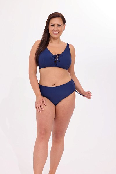 Бюст пляжный выполнен с мягкими чашками, без косточек, с боковым подкроем, с дополнительными боковыми поддержками для предотвращения скатывания, чашки продублированы эластичной сеткой, пояс со стабилизирующей сеткой, между чашек шнуровка (в темно-синем цвете тесьма под шнуровку на чашках-черного цвета), под лифом вшита широкая эластичная резинка, бретельки регулируются по длине, не отстегиваются, на спине застёжка, фурнитура металлическая цвета желтого золота. Плавки не входят в комплект!