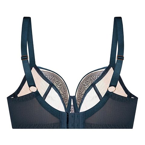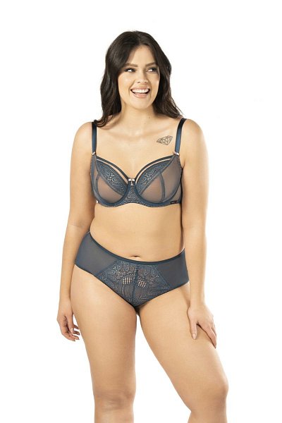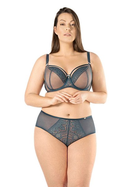 Бюстгальтер Daniela M выполнен на косточках, с дополнительными боковыми поддержками, чашки мягкие, шитые из сетки телесного цвета, покрытой сверху сеткой и кружевом, с боковым подкроем. Пояс из сетки продублирован телесной сеткой. Бретельки пришиты, регулируются по длине. На спине застёжка на удлинитель, фурнитура цвета меди.