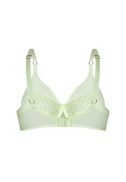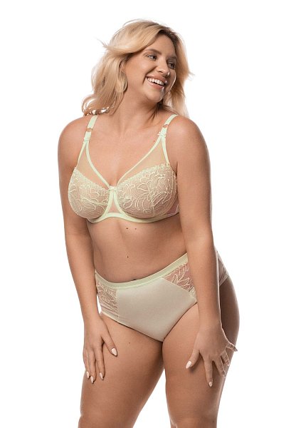 Бюстгальтер Janette M выполнен на косточках, чашки мягкие, с боковой корректирующей сеткой, шитые из сетки в цветочной вышивкой, верх чашки из сетки, бретельки не отстёгиваются, регулируются по длине. Спинка из двух слоев сетки. На спине застёжка на удлинитель, количество крючков в ряду застёжки увеличивается пропорционально размеру бюстгальтера. Фурнитура металлическая цвета желтого золота.