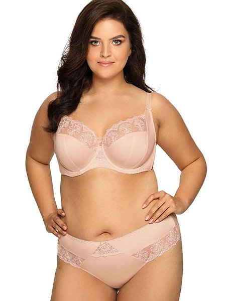 Бюстгальтер на косточках, с дополнительными боковыми поддержками, чашки мягкие, шитые из гладкого трикотажа, верхняя часть чашки из сетки с вышивкой, бретельки не отстёгиваются, регулируются. На спине застёжка на удлинитель.