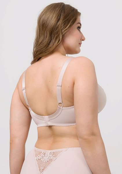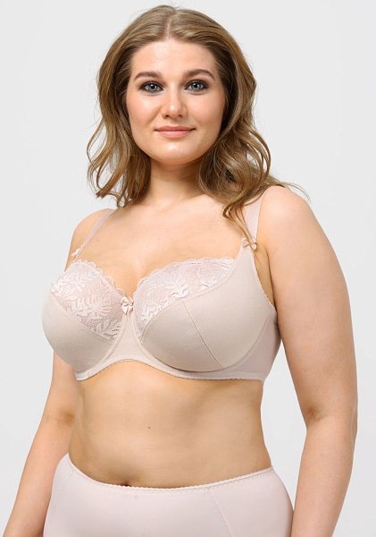 Бюстгальтер A-71 M в темно-синем цвете выполнен на косточках, с боковыми поддержками, чашки мягкие, шитые из гипюра с цветочным рисунком, продублированы телесной сеткой, верх чашек из сетки и кружева с «ресничками», спинка из плотной сетки. Бретельки не съемные, регулируются по длине, на спине застёжка - удлинитель на крючках, фурнитура металлическая крашеная.