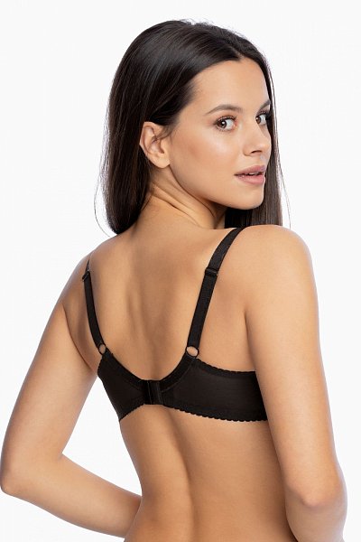 Бюстгальтер Keto выполнен на косточках, с дополнительными боковыми поддержками, чашки шитые, нижняя часть на тонком поролоне (в черном цвете поролон телесного цвета), внутренняя сторона прошита хлопковым трикотажем, верхняя часть чашки из тонкой сетки (в черном бюсте телесного цвета), внешняя часть из кружевного полотна с растительным рисунком, спинка из стабилизирующей сетки. Бретельки не отстёгиваются, регулируются по длине, на спине застёжка - удлинитель на крючках, фурнитура металлическая крашеная.
