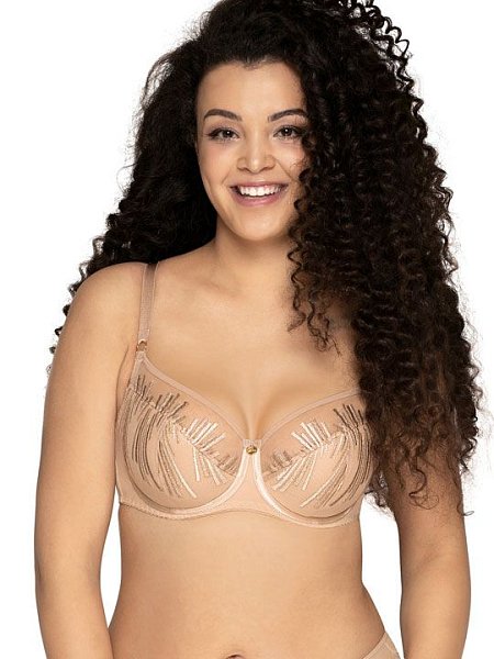 Бюстгальтер на косточках, с боковыми поддержками, чашки шитые, нижняя часть на тонком поролоне, внутренняя сторона прошита хлопковым трикотажем, внешняя из тонкой сетки с вышивкой. Бретельки не отстёгиваются, регулируются по длине, на спине застёжка - удлинитель.
