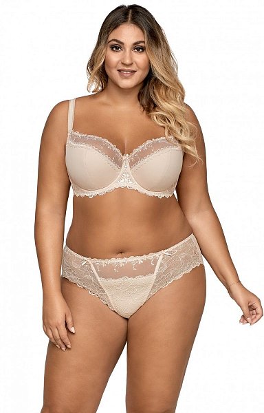 Бюстгальтер полусшивной, вертикальные боковые косточки, верхняя часть чашки из богато отделанного кружева, нижняя из плотной ткани, изнутри чашки отделаны хлопком.