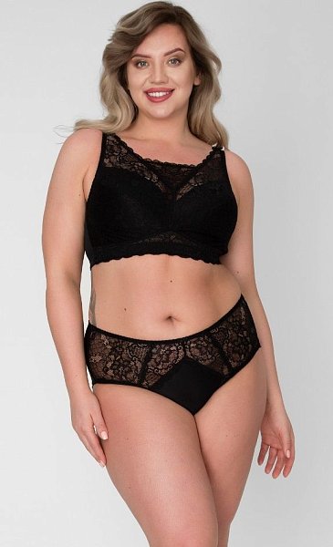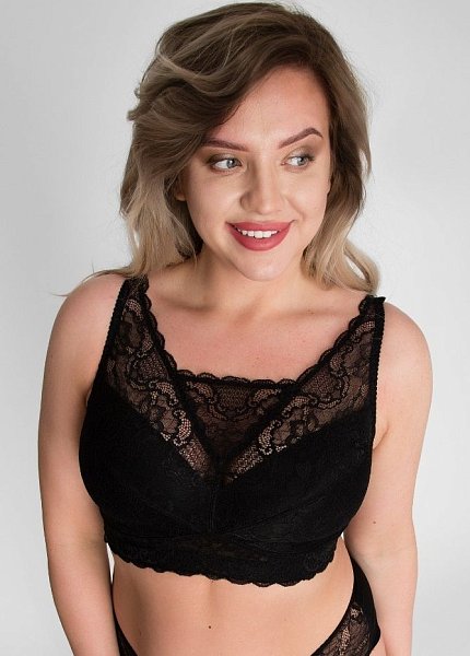 Бюстгальтер-топ выполнен с мягкими чашками на косточках, с дополнительными боковыми поддержками, чашки шитые из неэластичной сетки, снаружи покрыты гипюром, спинка из стабилизирующей сетки, Бретельки регулируются по длине, не отстёгиваются, на спине застежка-удлинитель, фурнитура металлическая крашеная.