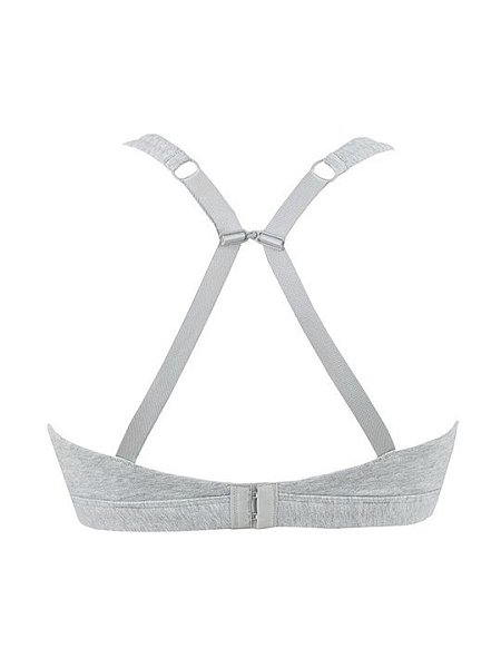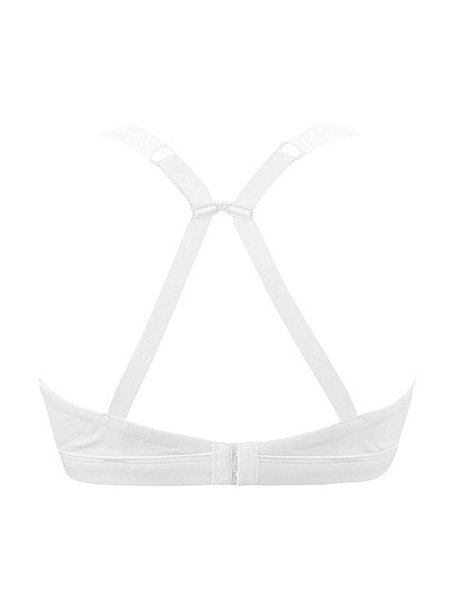 Бюстгальтер с мягкими двухслойными чашками, без косточек. Бочок усилен вертикальными, гибкими пластинами. Бретели несъемные, регулируемые с крючком для альтернативной перестежки. Застежка в два ряда на три позиции.